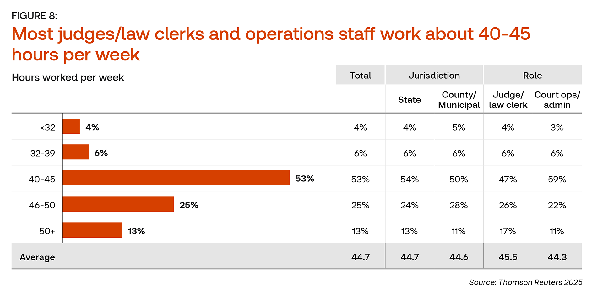 The report also found that 91% of court staff report working more than 40 hours each week, with about one-third of them working more than 46 hours per week.